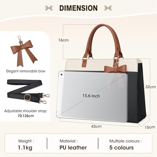 Dimensions & Storage: The laptop bags for women measures 43*15*32 cm and weighs 1.1kg, offering ample capacity while remaining portability. It features a padded compartment for a 15.6”laptop, a main compartment, four pen slots, two slip pockets, an internal zippered pocket, two side pockets for bottles or umbrellas, a detachable key clip, and an external zippered pocket. This multi-pocket design keeps everything neat and easily accessible.