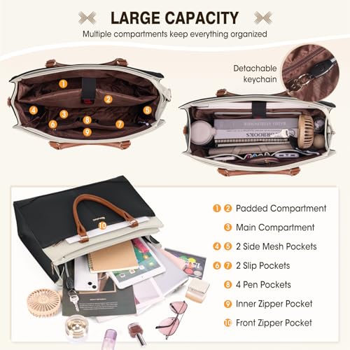 Durability & Protection: This work bags for women is crafted from premium cross-grain PU leather, offering excellent waterproof and scratch-resistant properties. A premium polyester lining, reinforced stitching, smooth zippers and sturdy metal hardware ensure its durability. Four metal feet on the base prevent ground abrasion. From materials to details, meticulously crafted to be your dependable daily companion.