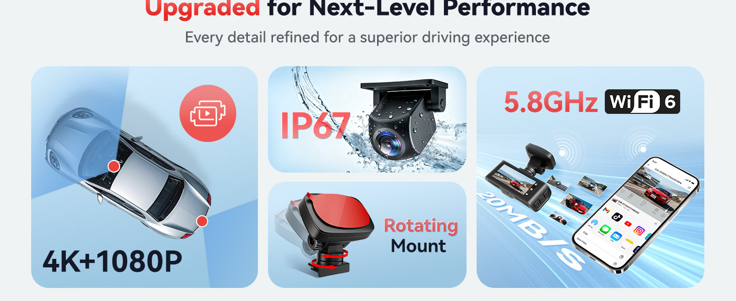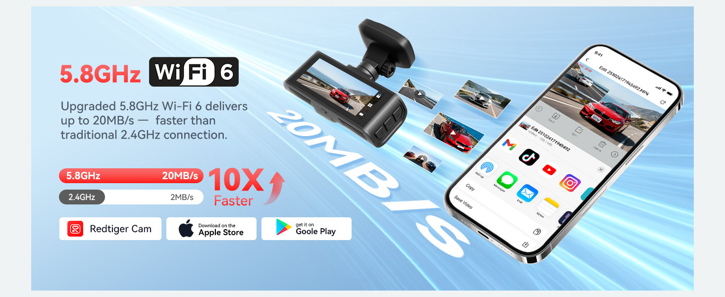 - [20MB/s 5.8GHz WiFi Transfer] With advanced wireless dash cam connectivity, enjoy download speeds up to 20MB/s, allowing a 1-minute video to download in just 8 seconds and then easily share these on social media with friends and family. From the Redtiger Cam app to your smartphone, easily access videos, GPS route tracking, and OTA firmware updates directly – your smart dash cam 4K for instant access anytime, anywhere.