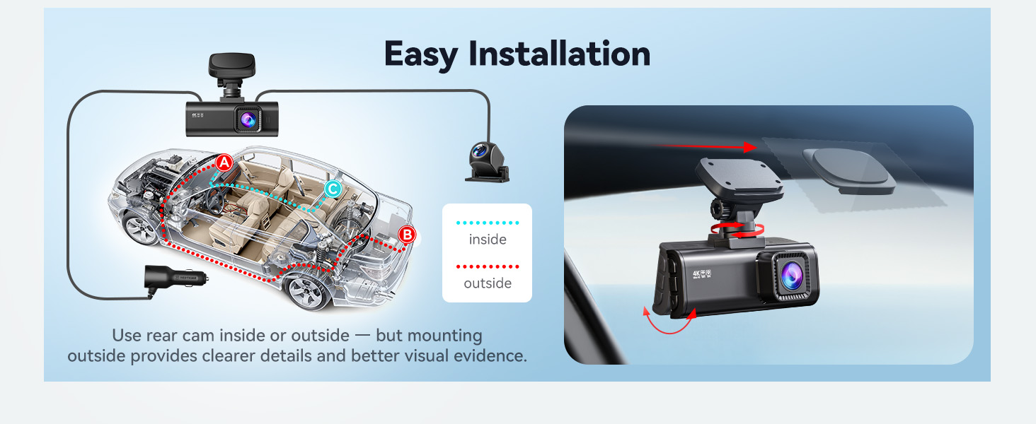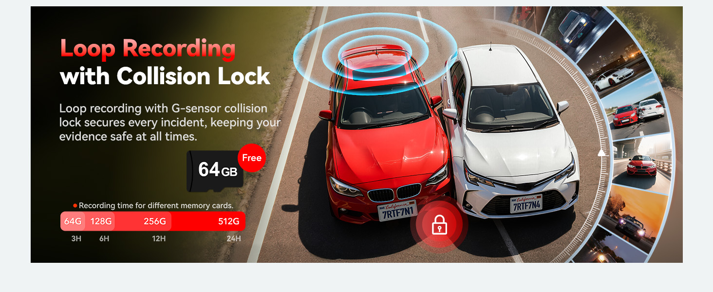 - [Loop & Lock Recording] Smart loop recording automatically overwrites dash cam for cars old footage when storage is full, while the built-in G-sensor locks collision recordings instantly to preserve crucial evidence during sudden impacts. The 64GB card included ensures car dash cam have ample storage space for trips and continuous use. REDTIGER front and rear dash camera gives you peace of mind for all your driving needs.