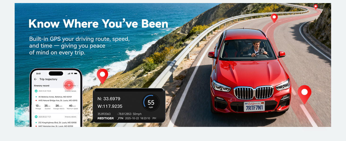 - [All-in-One Advanced Features] The REDTIGER F7N 4K dash cam front and rear delivers premium convenience and safety. Dash cam with GPS records speed, location, and direction on your footage — ideal for reviewing trips or providing solid evidence. It also includes a G-sensor, fatigue reminder, emergency video lock, screen saver, real-time speed display, compass direction, and a reliable supercapacitor for lasting performance.
