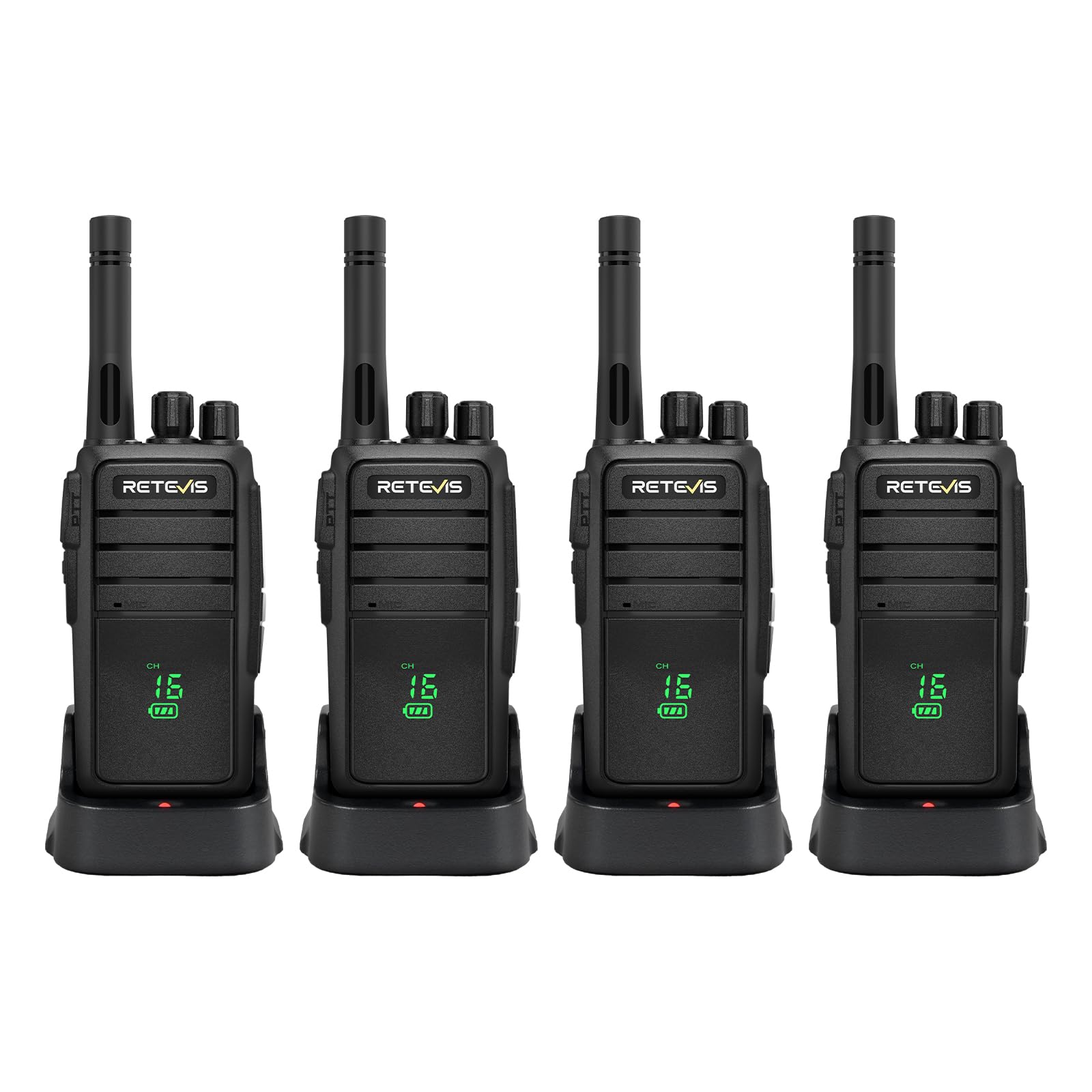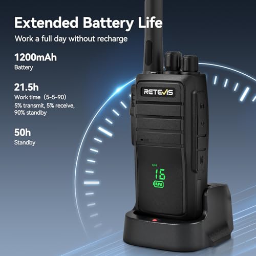 Long battery life; powered by a 1200mAh battery; this walkie talkie runs up to 21.5 hours; with 50h standby; right for long shifts in construction or retail; ensuring walkie talkies for business never quit before your team does