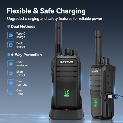 Safe charging; switch easily between base charging and Type-C for more flexibility in construction sites; hotels; or retail shops; the 2 way radio with 4 safety protections ensures safe; stable charging even in busy workplaces; reliable and convenient