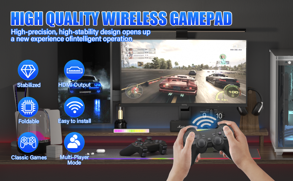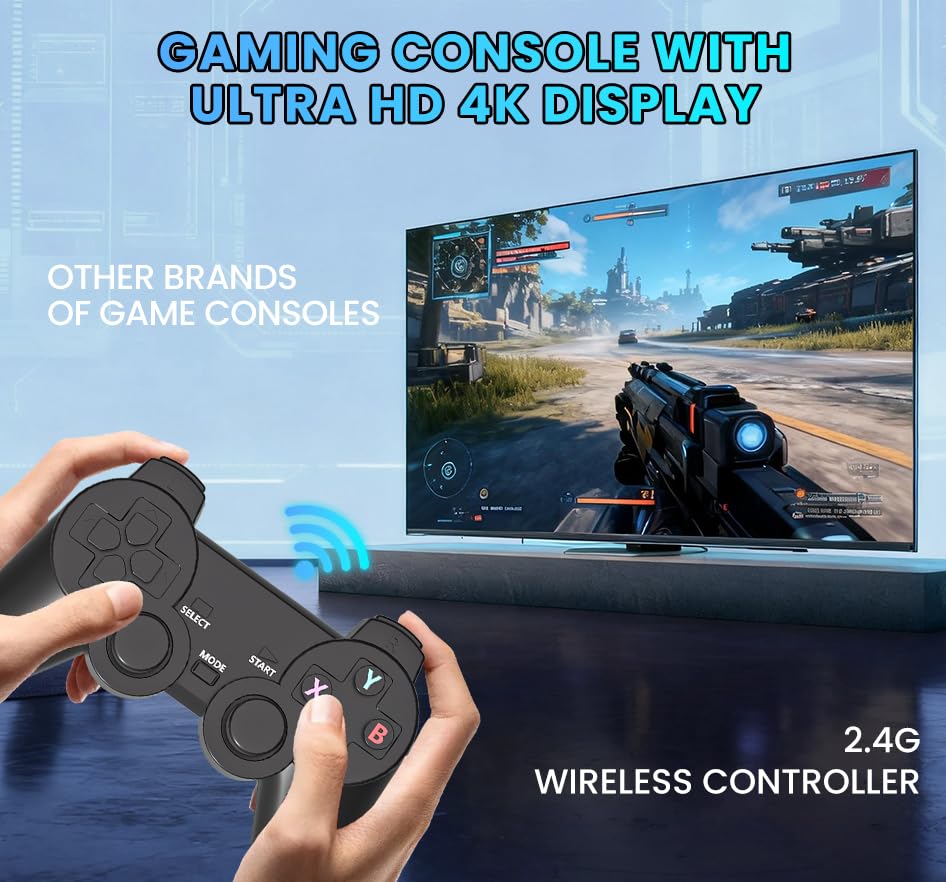 - 【Dual Wireless Controllers Low-Latency Co-op & Competition】Includes two 2.4GHz wireless controllers with stable connection up to 10 meters and near-zero latency. Ideal for cooperative or competitive play with family and friends on the big screen.