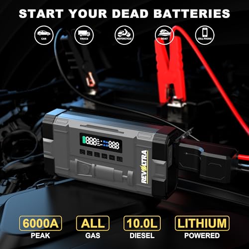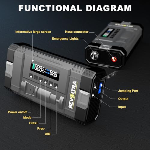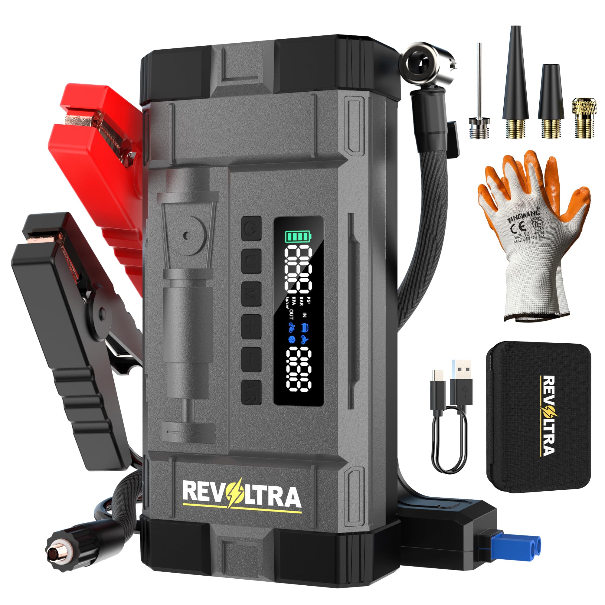 Revoltra 9-in-1 Jump Starter Power Pack With 150PSI Air Compressor, 6000A Car Battery Booster Jump Starter, Car Starter Power Bank With Jump leads & Insulated Gloves