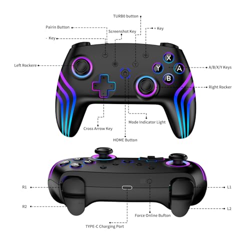 - 【Colorful RGB Lighting】The controller for Switch 2 features seven RGB lighting colors (red, orange, yellow, green, cyan, blue, and purple) and four lighting modes (dazzle, single color, single color breathing, and single color breathing cycle), allowing you to customize the lighting effects according to your game style or personal preferences. This enhances the immersive gaming atmosphere and makes each gaming session more personalized.