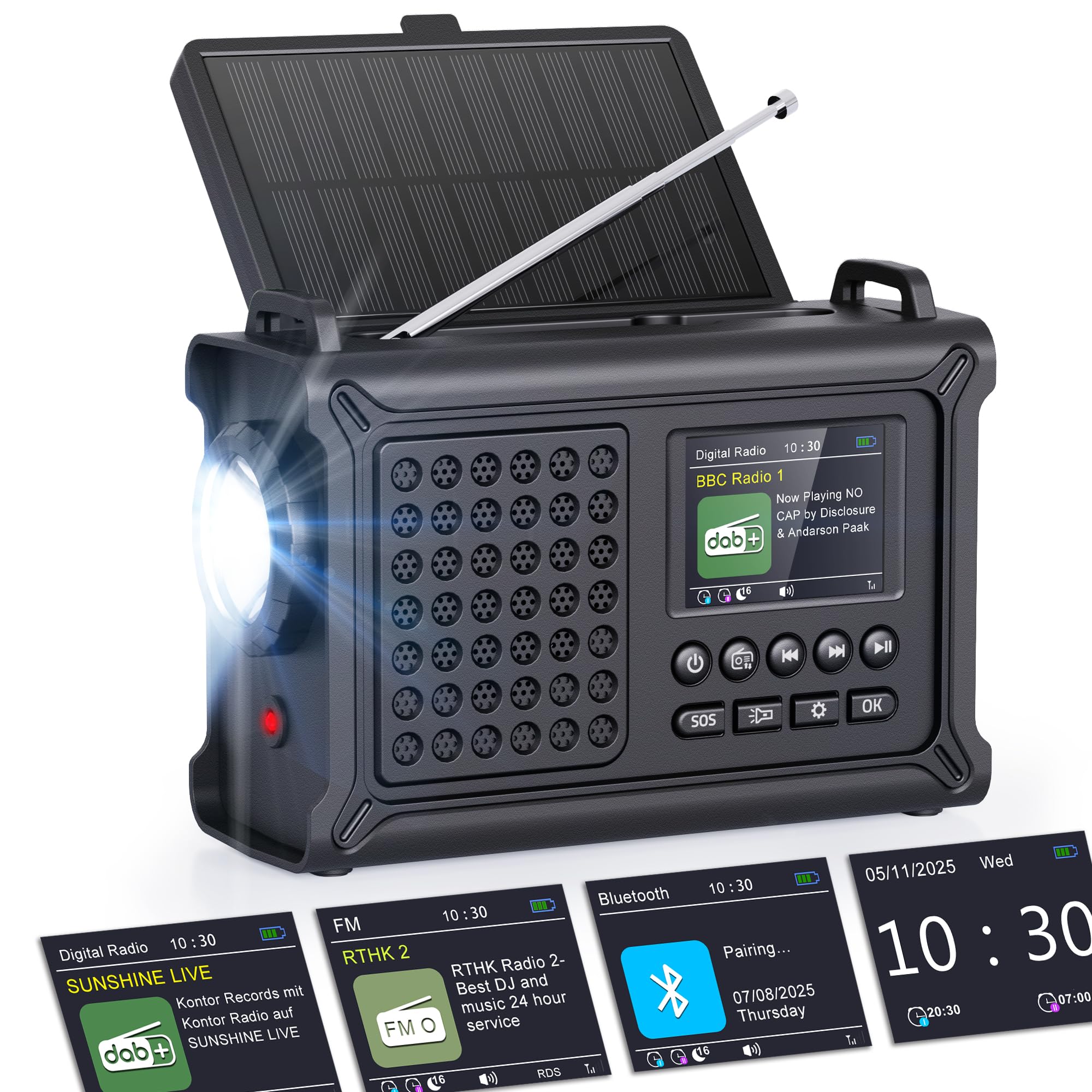 ROCAM DAB Wind Up Solar Radio with Bluetooth 5.0, 12000mAh Rechargeable Battery, Crank Radio with 8500mm² Solar Panel, 2.4″ LCD Color Display, 5W Flashlight for Emergencies & Outdoor & Camping