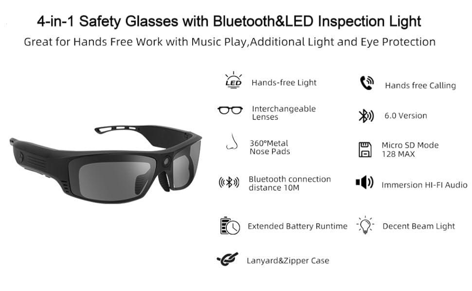 A bold innovation from us,the G4C smart Bluetooth safety glasses are the result of two years of in-depth market research.Starting from the foundation of safety glasses, our team has designed a product that merges the functions of safety eyewear,headlamp lighting,and Bluetooth audio playback.Perfect for everyday wear and specially engineered for demanding work environments,the G4C stands out with the following unique advantages: