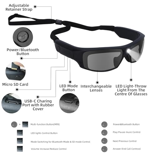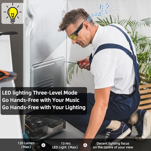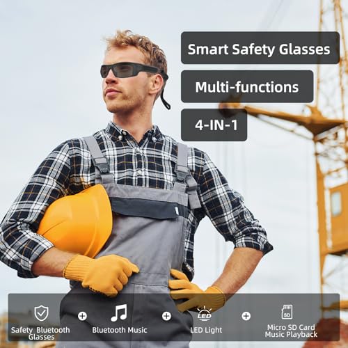 RONGJUAN Smart Bluetooth Glasses for Men&Women Ultra Loud Volume, Safety Glasses with Bluetooth Speaker Rechargeable LED Lights,20Hrs Runtime TR90 Frame (EN166)