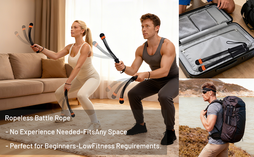【On-the-Go Ropeless Rope with Adjustable Intensity】- Take your gym anywhere. This lightweight and highly portable battle rope features an integrated hang strap for easy storage and transport. Fine-tune your effort by sliding the two weight rings: a subtle resistance boost when raised, or a standard cardio mode when lowered. This allows you to perfectly match the intensity to your energy level, making it ideal for everyone from beginners to pros