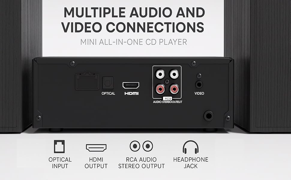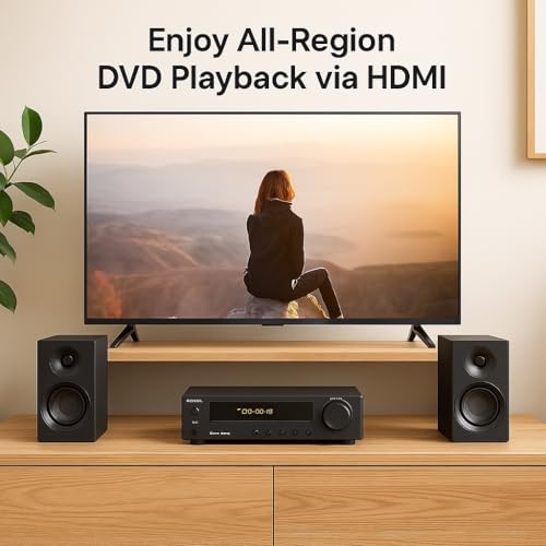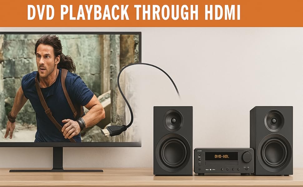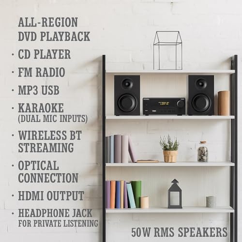 - All-in-one mini Hi-Fi for home audio and movies: region-free DVD and CD playback, Wireless BT streaming, USB music, FM radio and AUX. Connect TVs via HDMI, or use optical/coaxial for clear TV audio. Compact footprint fits shelves, bedrooms, kitchens and offices.