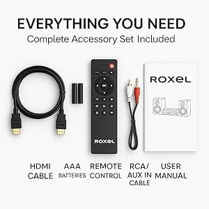 - Everything in the box: remote control, HDMI cable, RCA/AUX-in audio cable, 2 × AAA batteries and user manual. UK brand service and warranty for peace of mind. Unpack, connect and enjoy music, movies and karaoke the same day.
