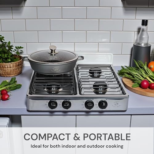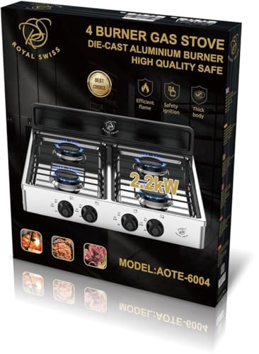Royal Swiss 4 Burner Gas Stove 2.2KW Die-Cast Aluminum 100% LPG Portable Heavy Duty Metal Housing Safe Ignition Outdoor Indoor Stove