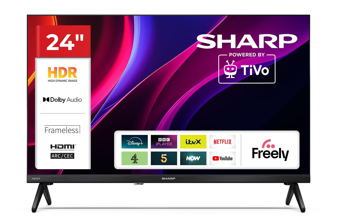 Sharp 24HE2245K 24-Inch HD Ready LED TV, 720p Resolution, TiVo OS Smart TV, Wi-Fi, 3 HDMI, 2 USB, HDR10, Built-in Freely