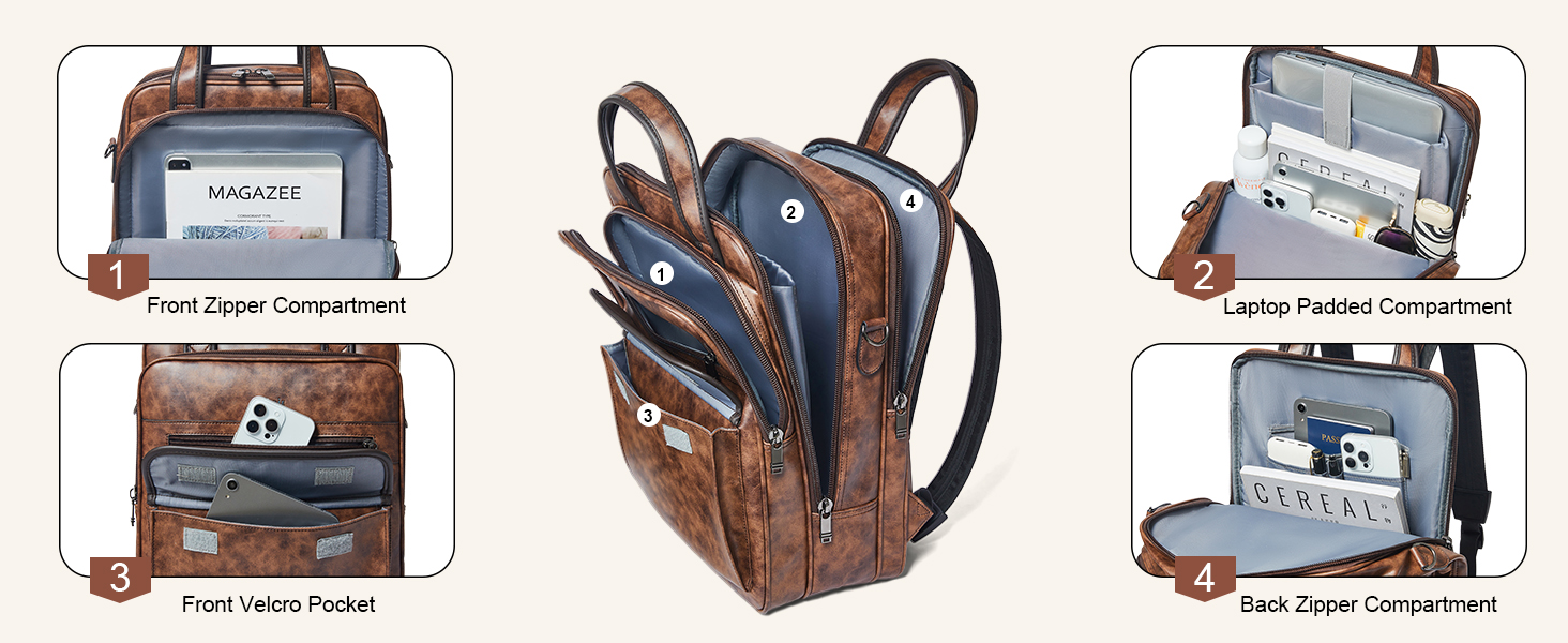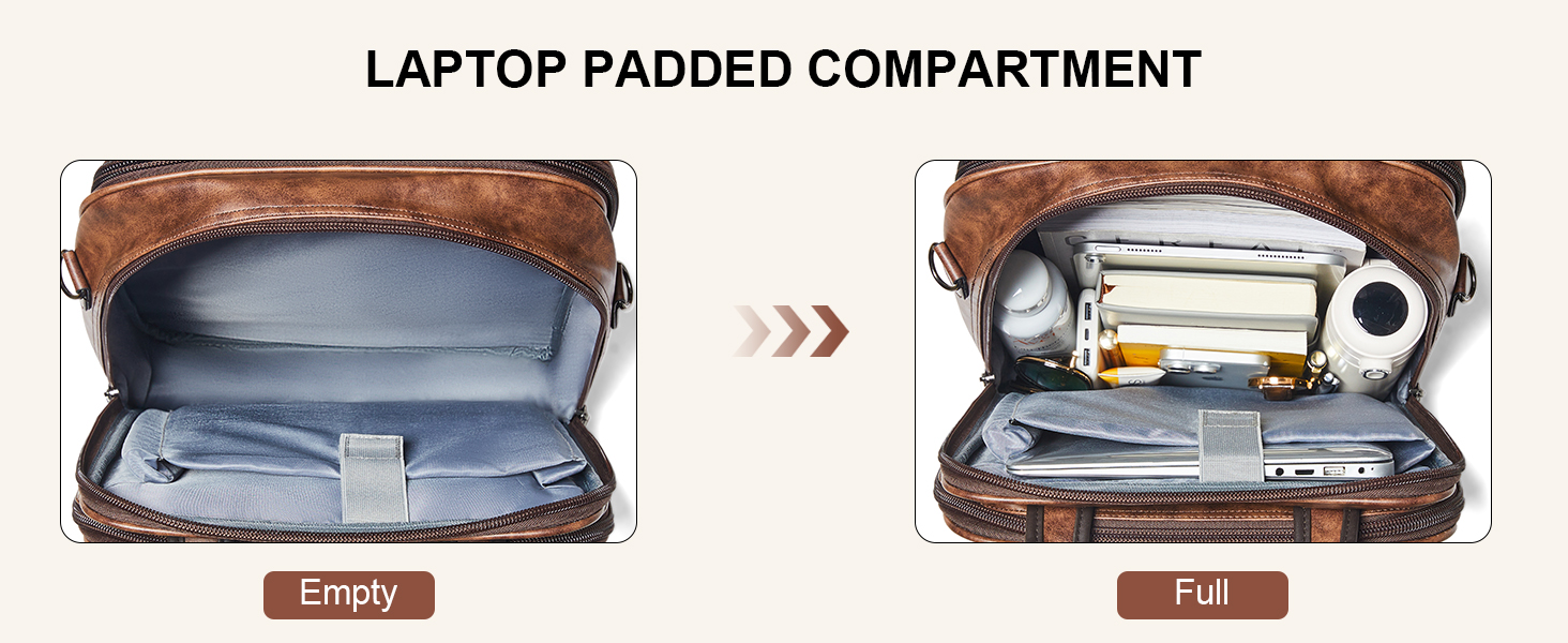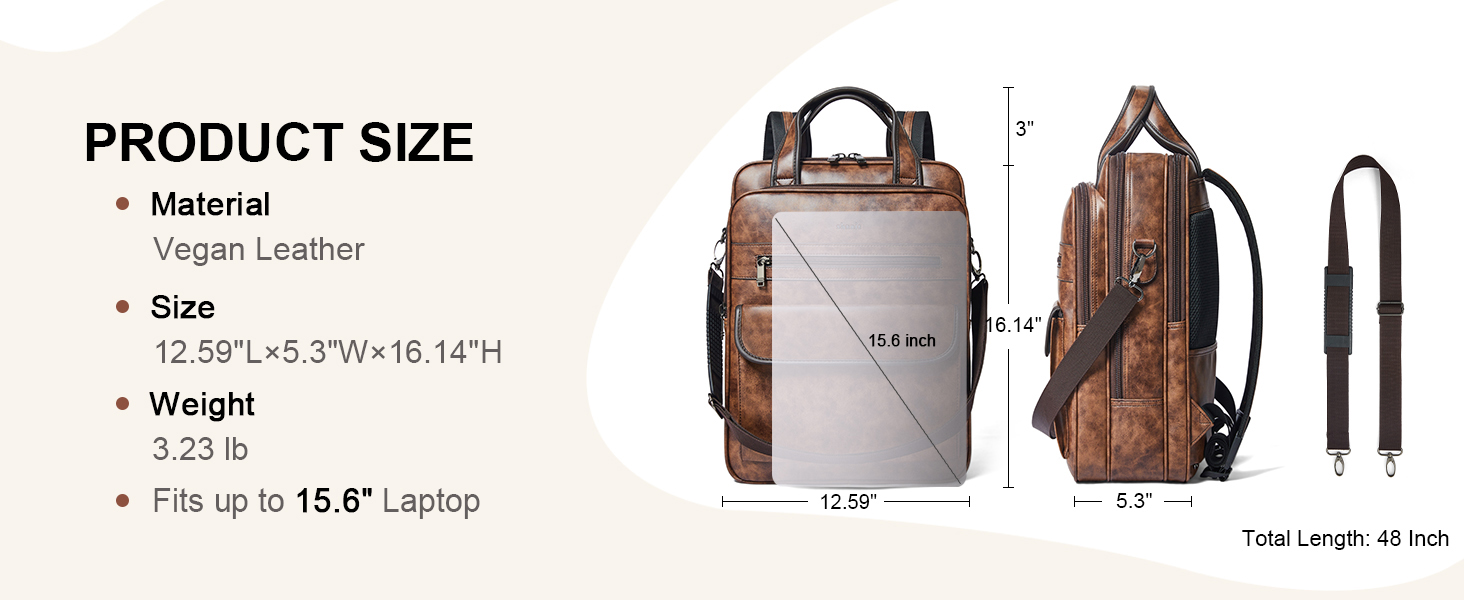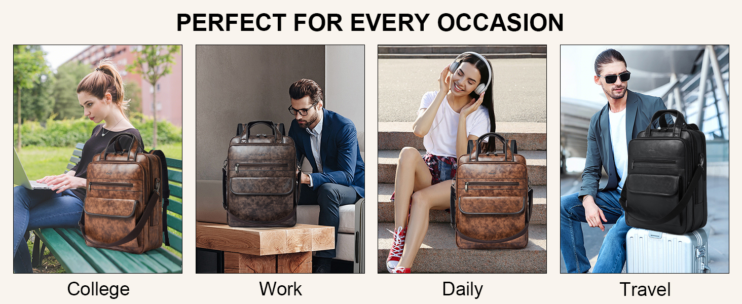 MULTIPURPOSE LEATHER LAPTOP BACKPACK: This backpack laptop offers three different carrying options for various occasions. It comes with a removable,adjustable shoulder strap and a top handle with velcro,so you can use it as a special shoulder bag,a casual daypack backpack or a stylish top handle backpack. Great as a college backpack,travel backpack purse and work backapck that can hold your daily essentials