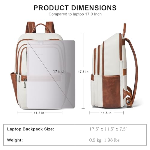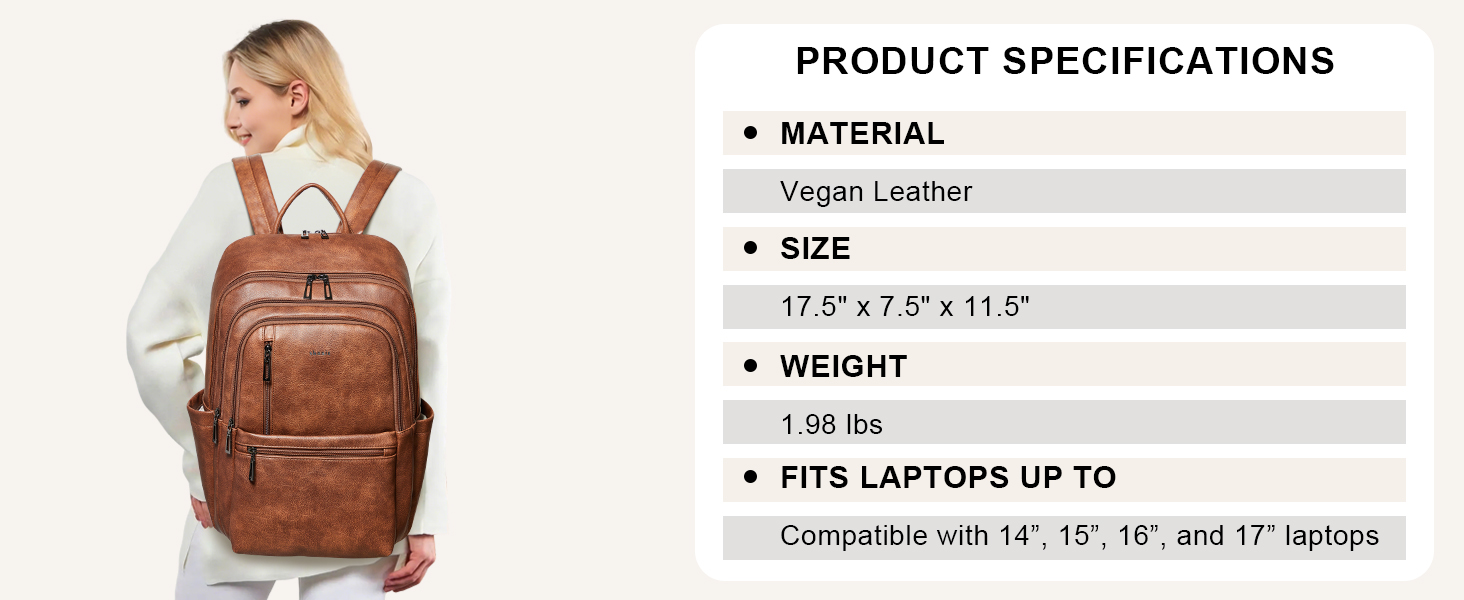 【Independent Laptop Bag】 The vegan leather backpack purse size is 12.6 " (L) x 7.9 " (W) x 17.7 " (H) and weight: 2.2lbs. It features a zippered compartment with a dedicated, padded divider for your 17-inch laptop. Its versatile design makes it suitable for a variety of situations, suitable for use as a student backpack, business backpack, work backpack, airport backpack, travel backpack or everyday fashion backpack, helping you to keep your belongings organised.