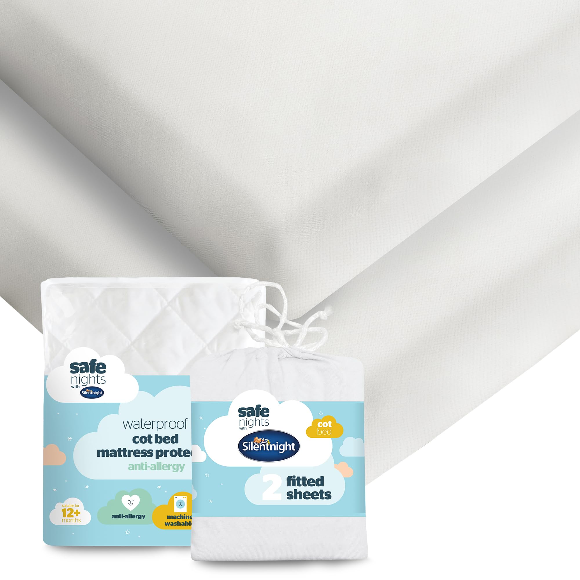 Give your little one the cosiest, cleanest sleep with this Safe Nights Cot Bed Fitted Sheet & Waterproof Protector Bundle. Designed with comfort, protection and practicality in mind, this duo helps keep their mattress fresh, dry and ready for peaceful sleep night after night. Shield your baby’s mattress from night-time accidents and spills with our soft-touch waterproof protector. The fitted skirt wraps securely around the sides of the mattress for complete coverage and a snug fit that stays in place. Filled with anti-allergy fibres to help keep bacteria at bay, it provides a clean, hygienic, breathable sleep surface. Suitable for 12 months+, hypoallergenic and fully machine washable for long-lasting freshness. An everyday essential for every nursery, our Safe Nights fitted sheets are made from soft, breathable 100% cotton to keep your baby comfortable all night long. Produced in an OEKO-TEX certified factory for ultimate peace of mind, the sheets are durable, easy care and tested to withstand up to 50 washes. Machine washable and tumble-dry friendly on a low heat. Silentnight are the UK’s number one sleep brand, with over 75 years’ experience in creating products that offer solutions for every sleeper.