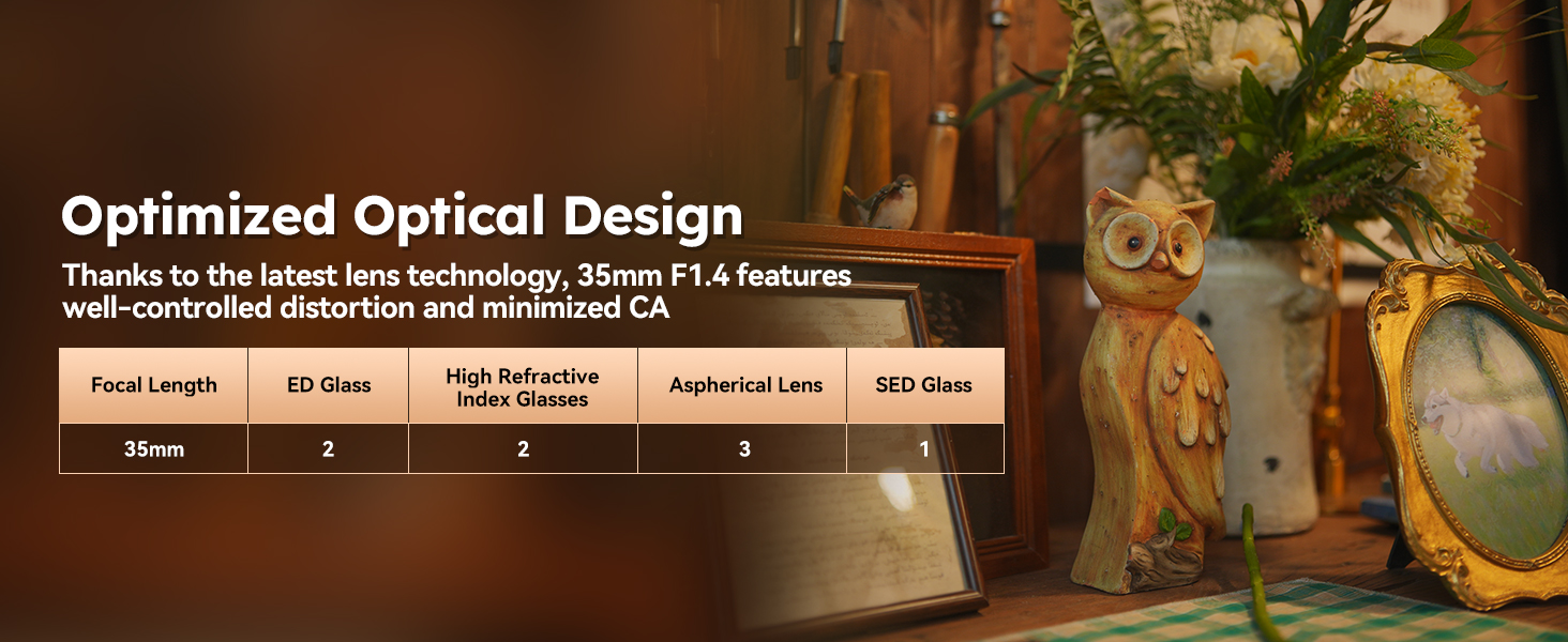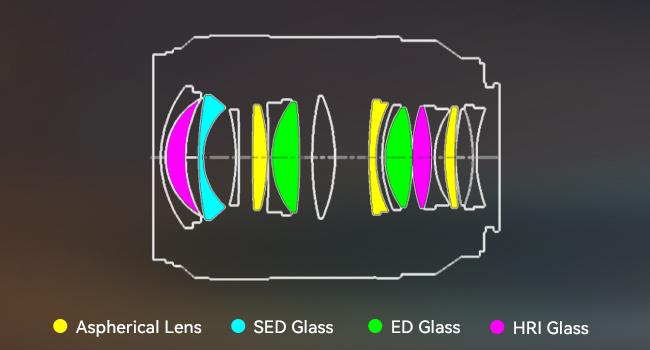 2 ED glass and 1 HRI glasses are added to provide outstanding optical performance with sharpness and well-controlled distortion. 3 aspherical lenses are included in 35mm to reduce lens size and better control distortion and CA. 1 SED glass reduces glare, chromatic aberration, and purple fringing.
