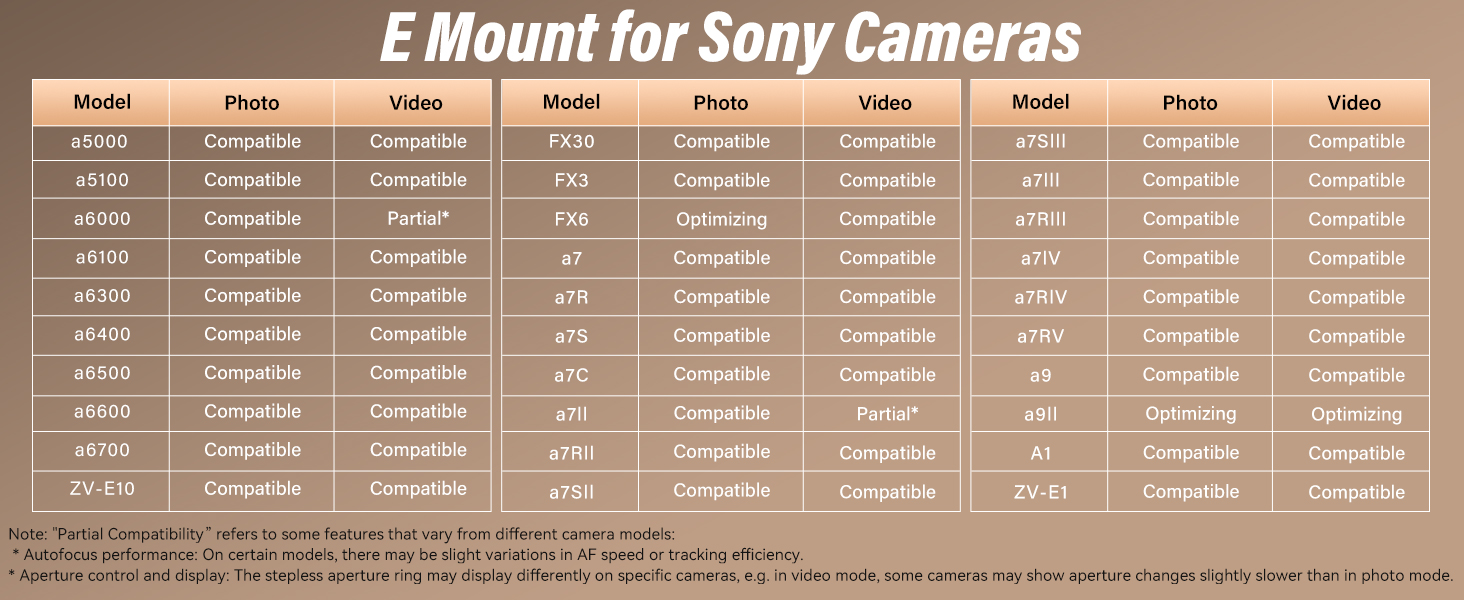 | Lens Format Coverage | Full-frame | Full-frame | APS-C | APS-C | APS-C | S35 | Full-frame |