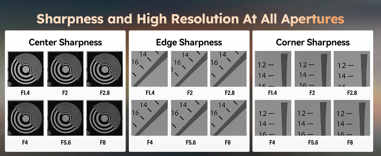 - Ultra Fast Aperture: This f/1.4 fast aperture lens is equipped with fifteen-blade diaphragms, ensuring sufficient light to enter into cameras even in low-light conditions. The blurred background decorated with magnificent bokeh also provides a dreamy look to your creative shots.