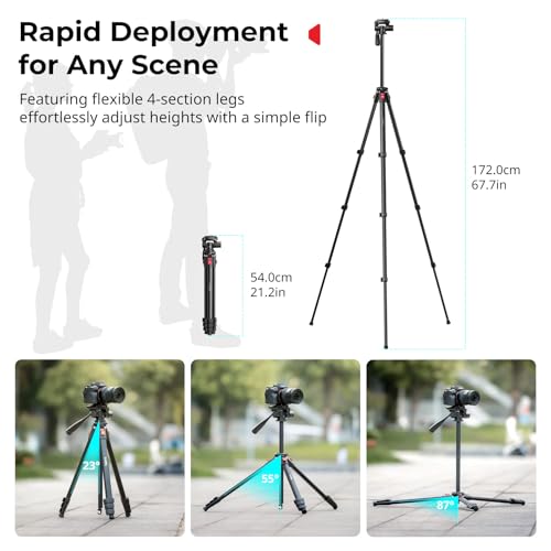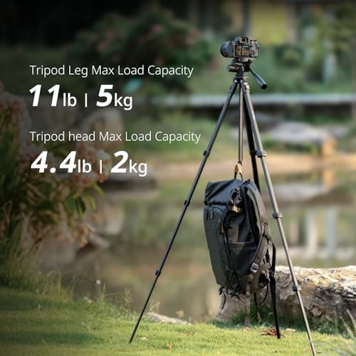 67.7" Travel Tripod: This camera tripod has a height adjustment range of 21"-67.7"/54-172 cm, which can greatly meet your needs of daily work. Constructed from aluminum alloy, the legs support up to 5kg (11lb), while the video head can handle loads of up to 2kg (4.4lb). The built-in bubble level ensures precise leveling across various shooting scenarios.