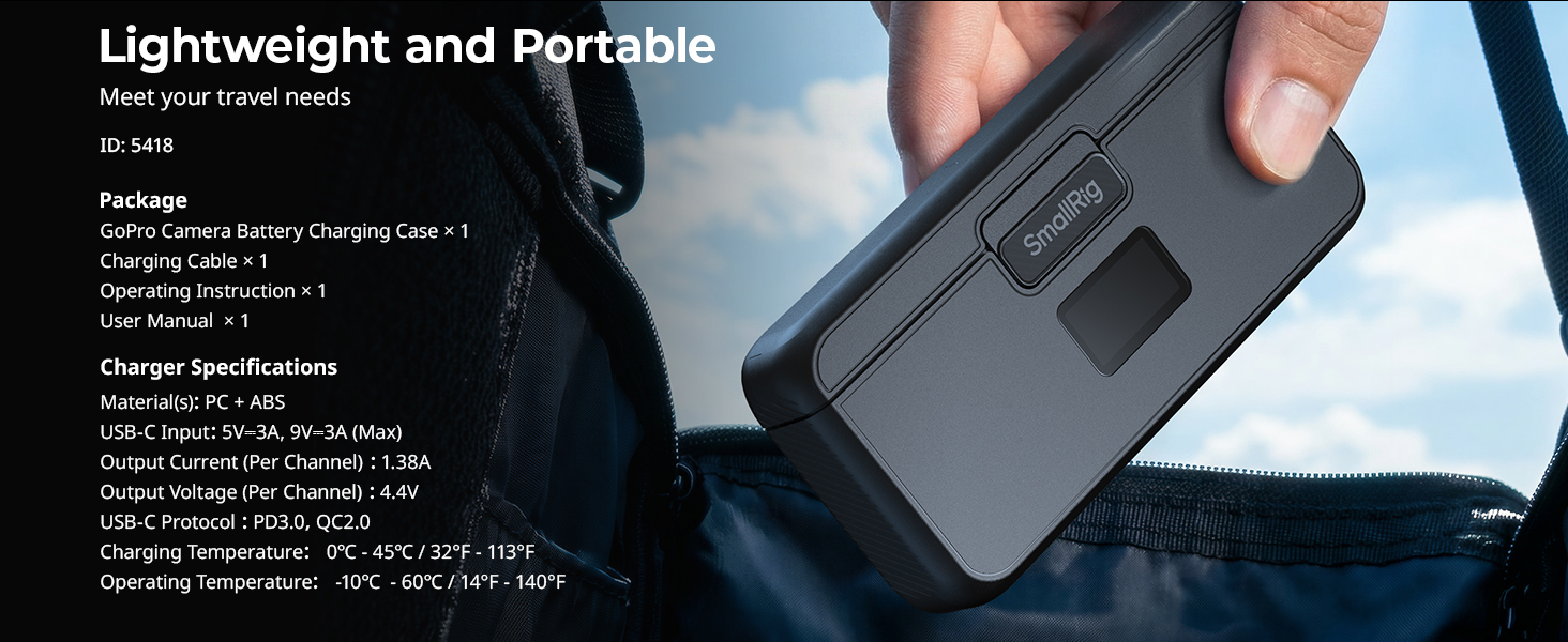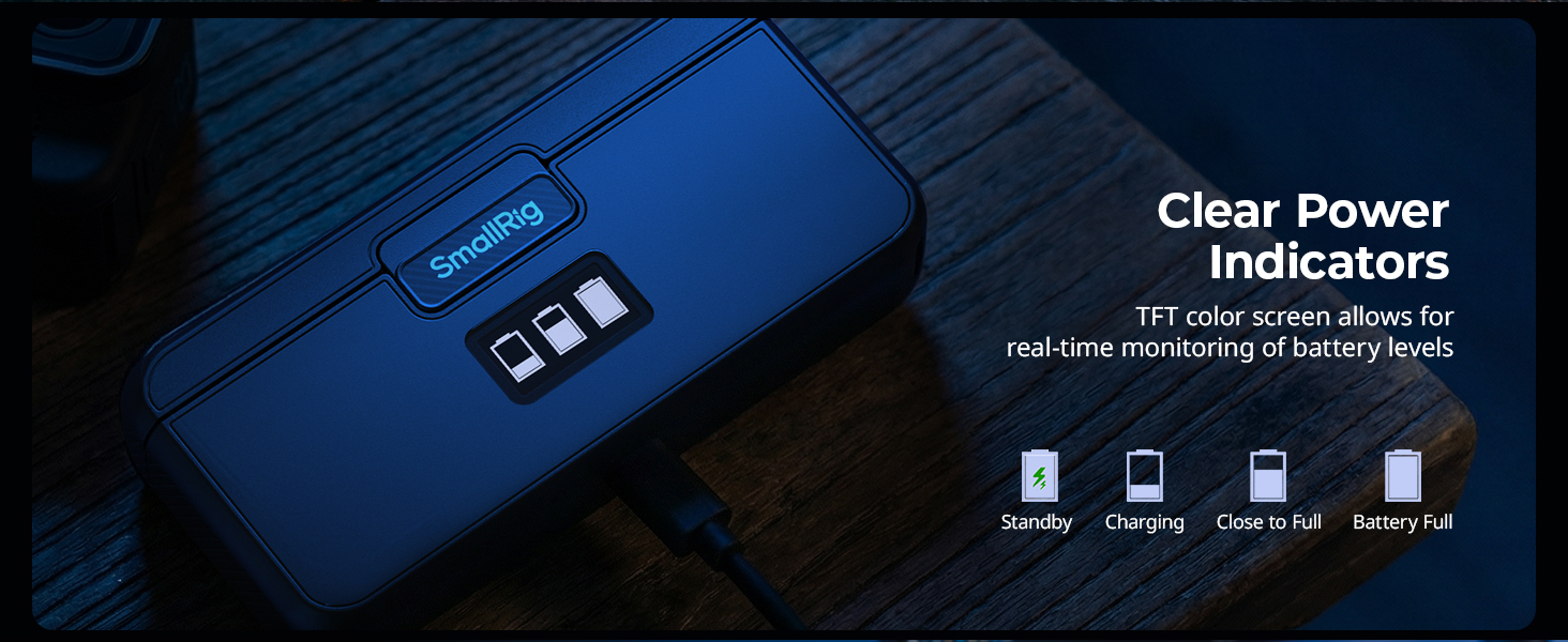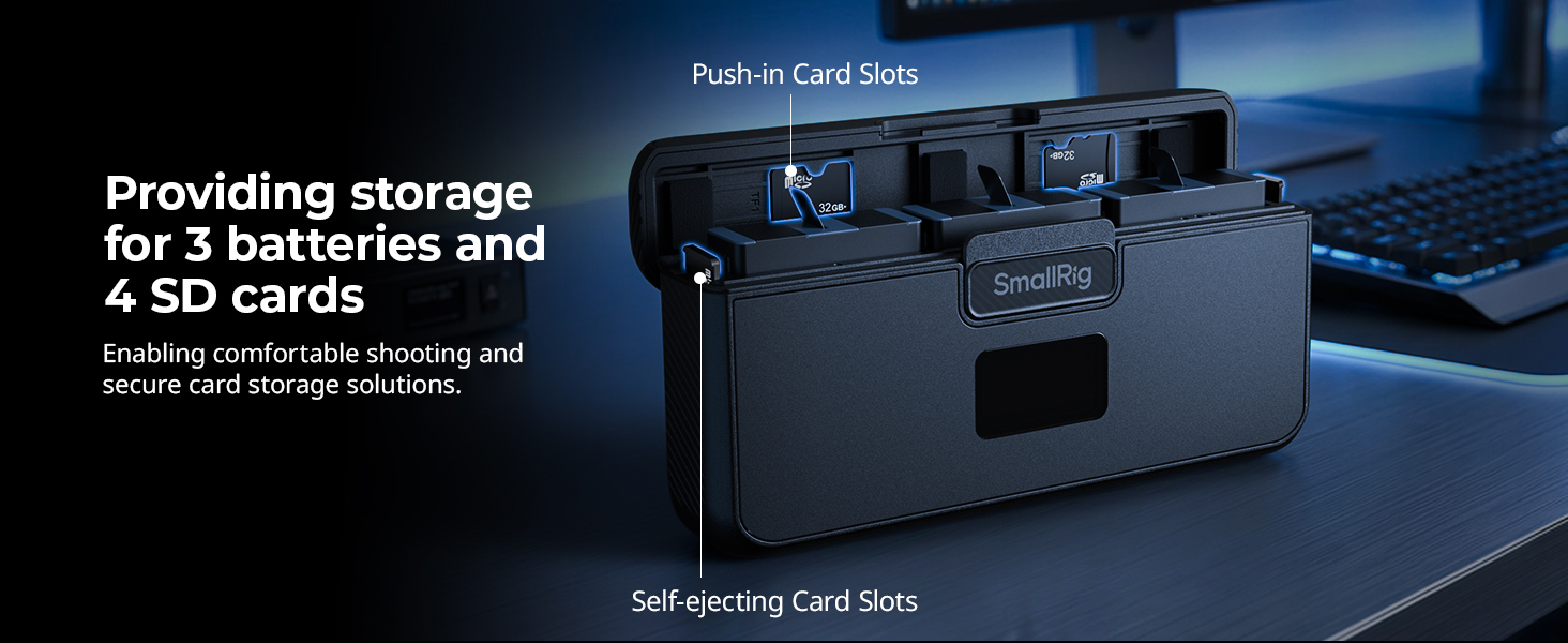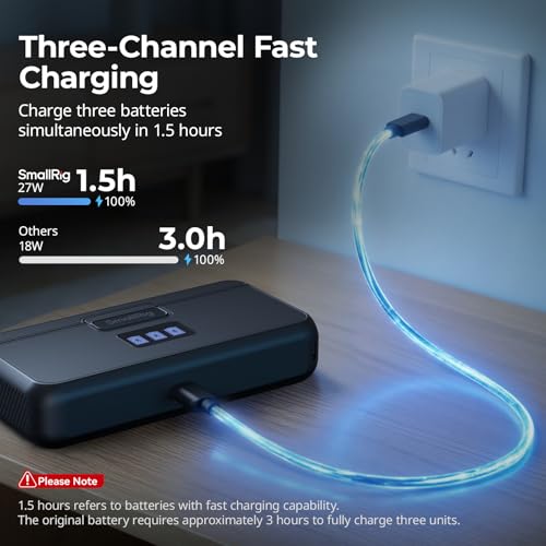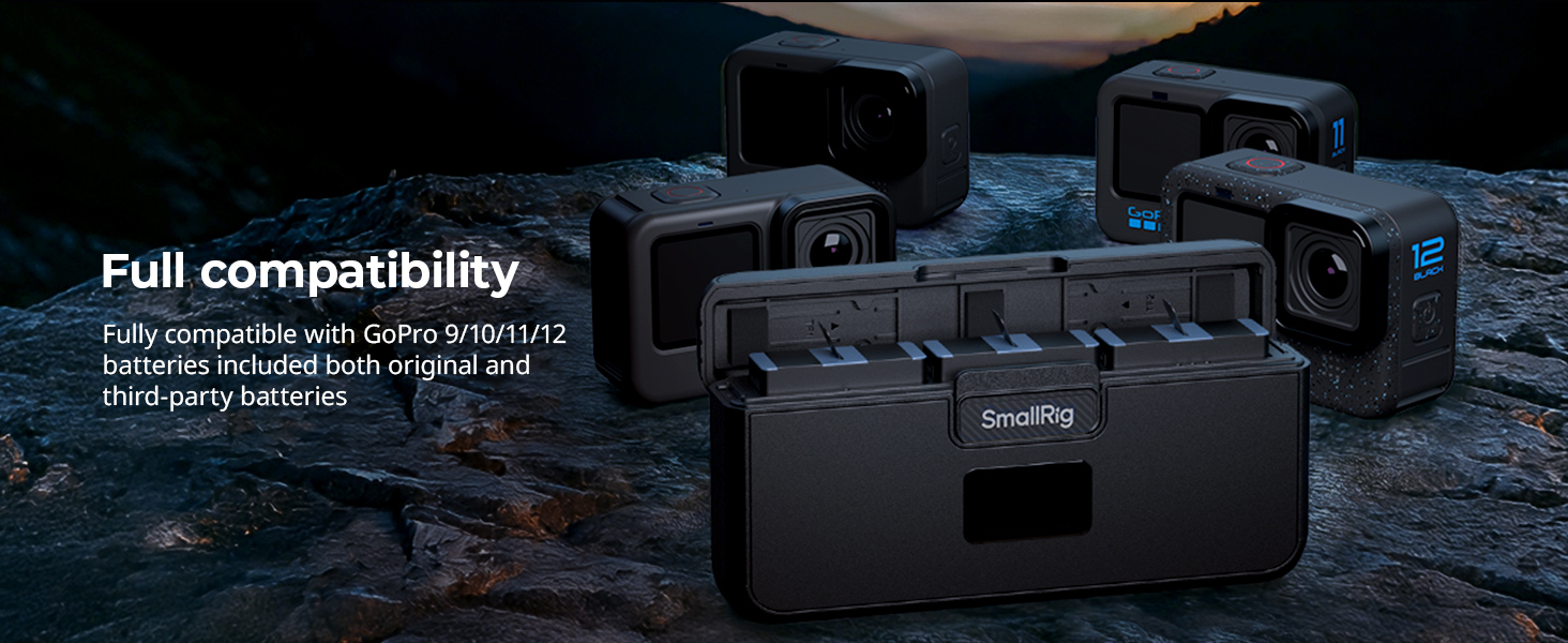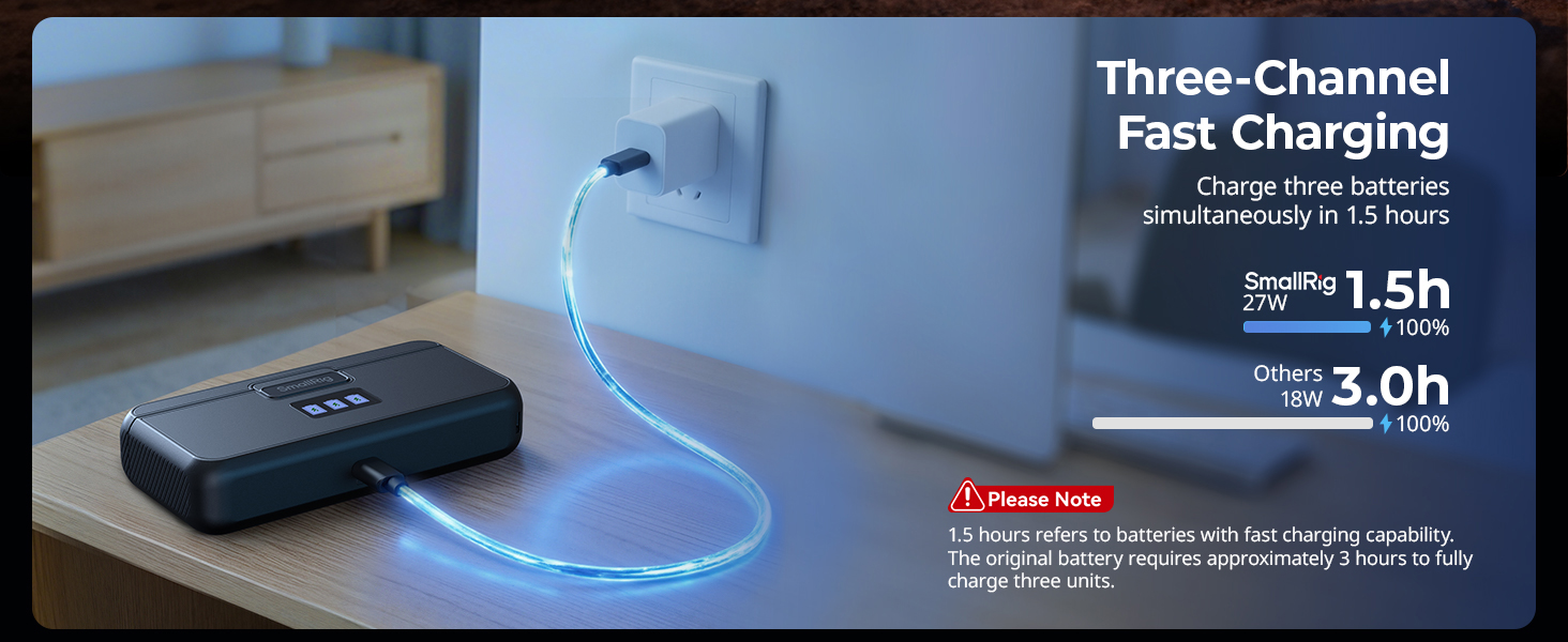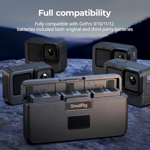 THREE-CHANNEL PD 27W FAST CHARGING:The Smallrig battery charger for Gopro is engineered for high-efficiency performance. Its powerful 27W power delivery technology can simultaneously charge three batteries to full capacity in approximately 1.5 hours, significantly reducing wait times so you're always ready to capture the action. NOTICE:1.5 hours refers to batteries with fast charging capability. The original battery requires approximately 3 hours to fully charge three units.