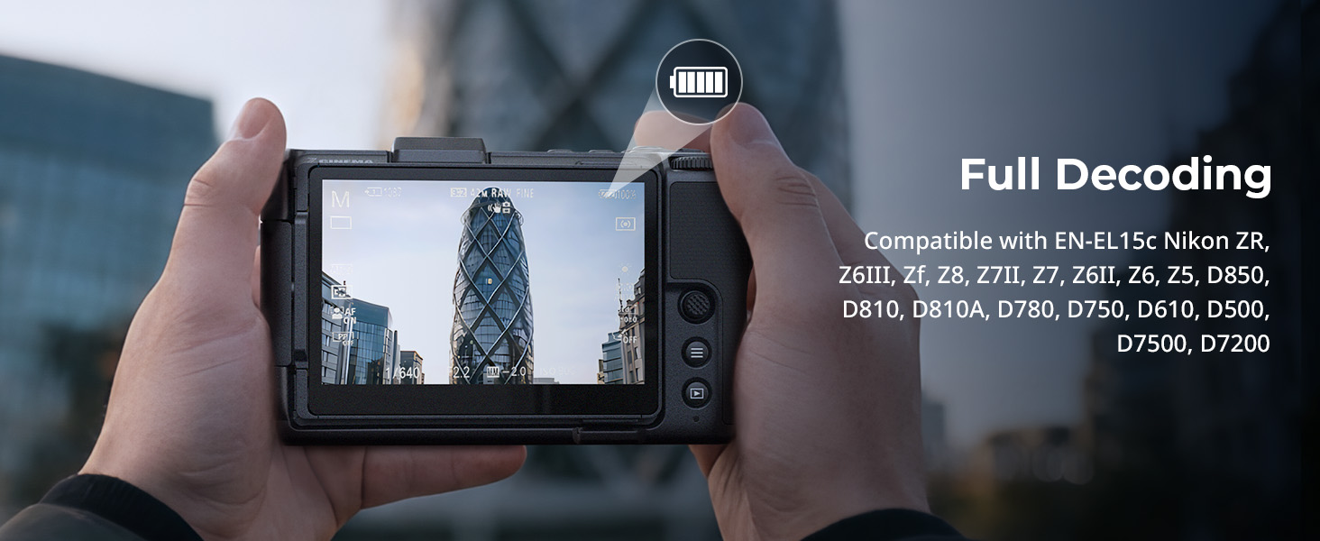 - Full Decoding: Utilizes a full decoding chip, compatible with Nikon ZR/Z6III/Zf/Z8/Z7II/Z7/Z6II/Z6/Z5/D850/D810/D810A/D780/D750/D610/D500/D7500/D7200. No camera pop-up warnings, supports battery level display, and is compatible with Nikon original chargers.