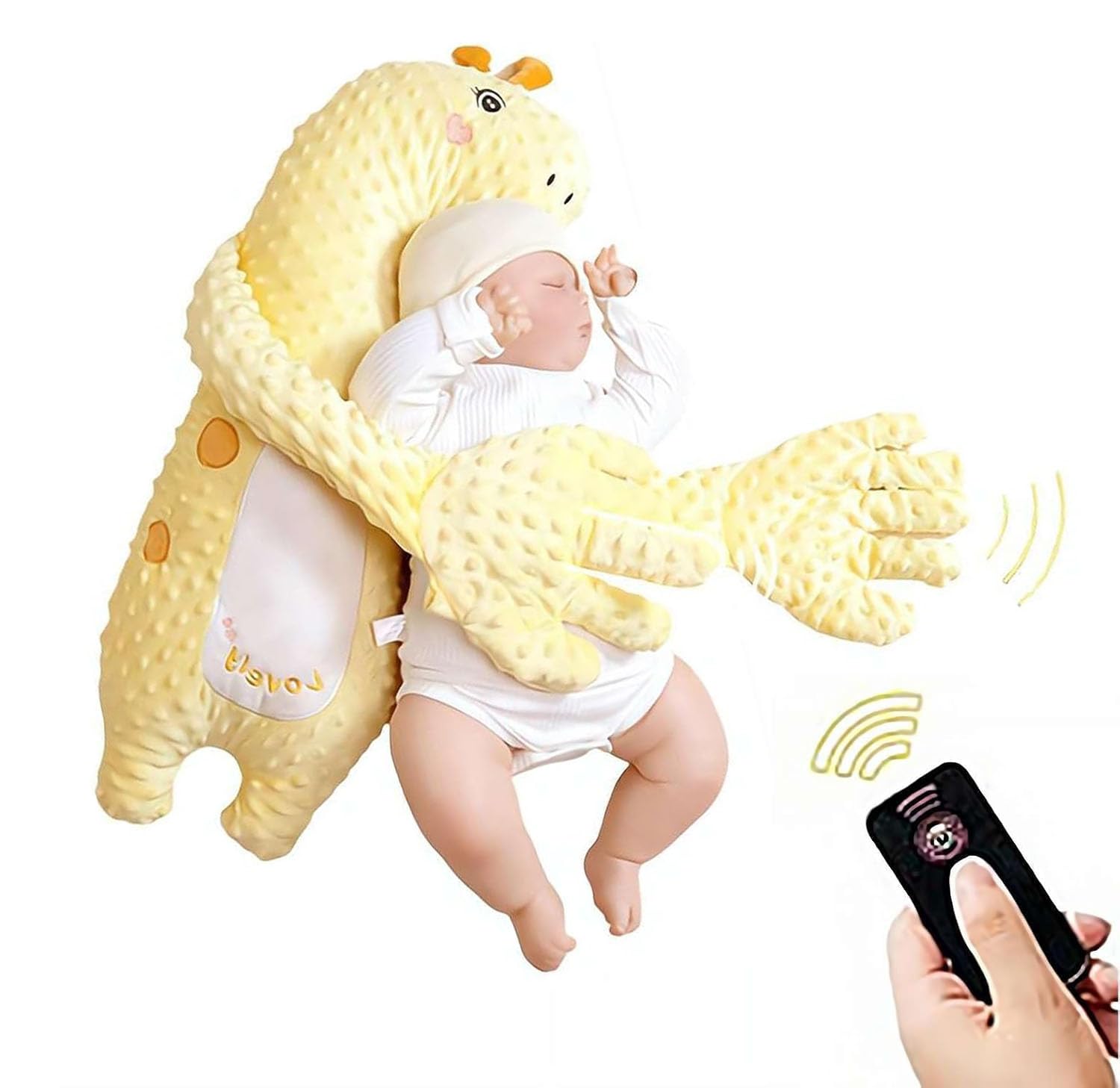 Description 1. Multi-Stage Infant Support: This comforting companion is specifically designed for babies aged 0-1 year, offering tailored benefits as they grow. For infants 1-3 months old, it encourages head lifting practice, while at 2 months, it can assist with burping. From 4-12 months, it serves as a gentle source of comfort and accompaniment, providing a consistent presence for your little one. 2. Product Details: This soothing baby toy is constructed from soft plush material and filled with gentle PE particles, ensuring a comforting feel for your infant. It measures 65 cm (approximately 25.6 inches) in length and 24 cm (approximately 9.4 inches) in width. 3. Simulated Embracing Comfort: Our unique patting feature is engineered to replicate the gentle, rhythmic pats of a parent’s hand, creating a secure and calming sensation for your baby. This design aids in settling them into a peaceful slumber, fostering a feeling of closeness and tranquility. 4. Enhanced Comfort Features: The baby comforter includes a PE bean hot pack (weighing approximately 150g) that can be heated to provide soothing warmth, reminiscent of a mother’s tender hand. Additionally, a convenient remote control is provided to easily operate the patting mechanism, allowing for customized comfort adjustments. 5. Thoughtful Design for Restful Sleep: Featuring a strategic three-point gentle pressure design, this baby plush ensures stable positioning and a more secure feeling, promoting restful and undisturbed sleep throughout the night. Its crafted to provide a steady presence, helping babies feel calm and secure. Package list * 1 Plush Doll * 1 Remote Contro