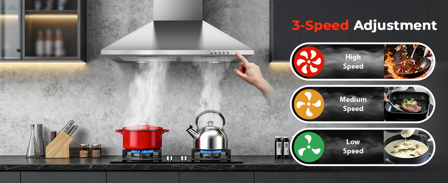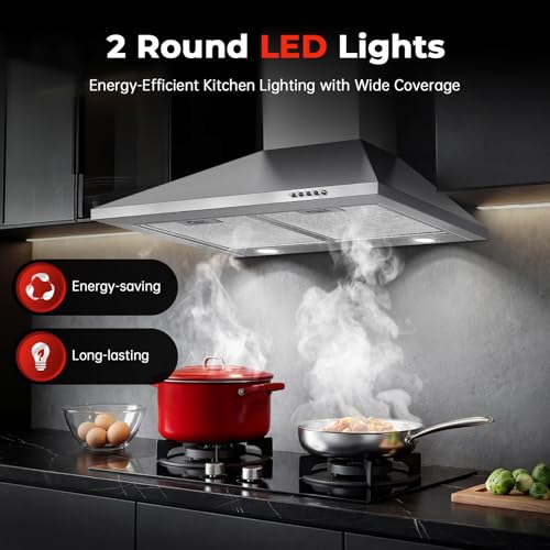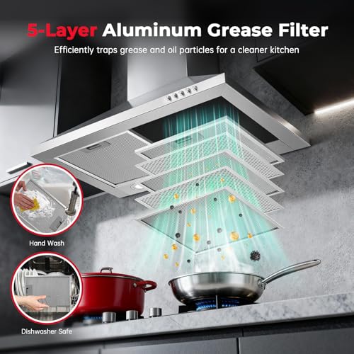 - User-Friendly Design: Designed as a practical wall-mount vent hood for 60cm spaces, it operates with ease using intuitive mechanical buttons, offering 3-speed fan control and bright LED kitchen lighting. The 5-layer aluminum grease filter is fully removable and dishwasher safe, making cleanup quick and hassle-free for long-term convenience.