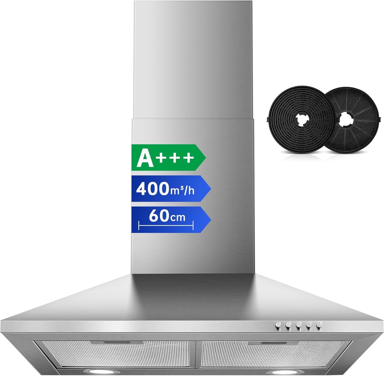 SNDOAS Cooker Hood 60cm, 400m³/h Stainless Steel Chimney Extractor Hood, A+++, 3-Speed Extractor Fan for Kitchen with Carbon Filters, Recirculating & Ducting Wall Mounted Range Hood [Energy Class A+++]