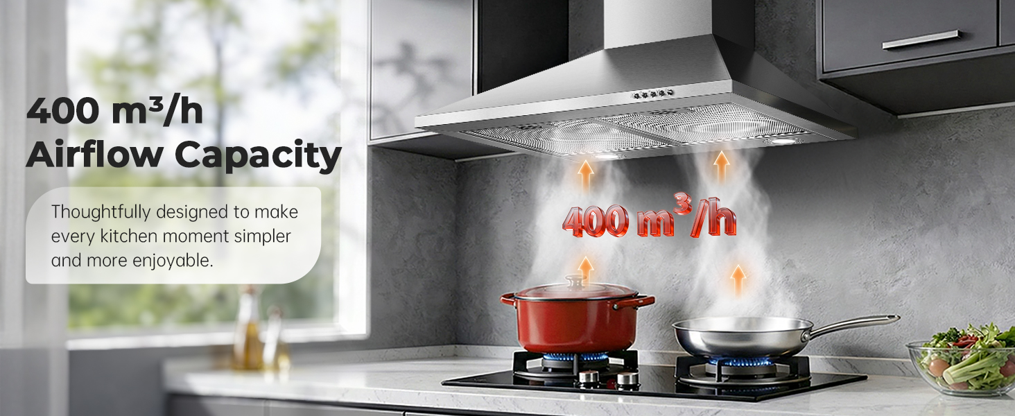 - Powerful & Quiet 400 m³/h Extraction: Equipped with a high-performance DC motor, this 60cm kitchen extractor hood delivers a strong 400 m³/h airflow to effectively capture smoke, grease, and cooking odors. Its advanced engineering ensures quiet operation, creating a more pleasant cooking environment.