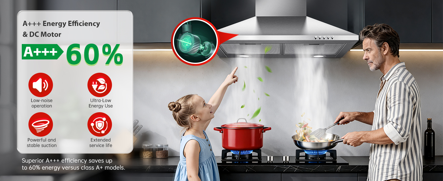 - A+++ Rated & Height-Adjustable: Certified with superior A+++ energy rating, this extractor fan kitchen consumes significantly less power, saving you money on electricity bills while being eco-friendly. The adjustable chimney height offers flexible installation to perfectly fit various kitchen cabinet layouts and ceiling