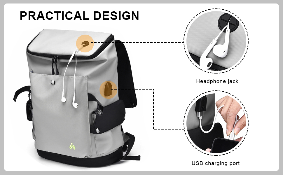 - The top of the rucksack features a headphone jack, allowing the headphone cable to pass through for listening to music conveniently