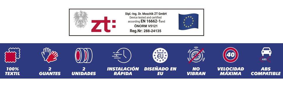 These chains are not only reusable but also hand washable in cold water, extending their lifespan and ensuring proper hygiene after use. Manufactured in the European Union under strict quality controls, they comply with EN-16662-1 and ÖNORM V5121 standards (Reg. Nr: 288-24135), making them a safe, reliable, and regulation-compliant choice.