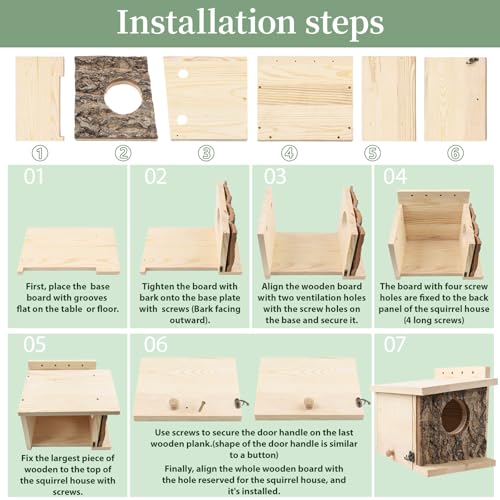 Easy Installation:Designed with convenience in mind, this squirrel house for outside nesting features four pre-drilled holes for easy mounting. our squirrel box come with instructions, and the required screws are included in the packaging, so you can easily install them and nail them to the tree.