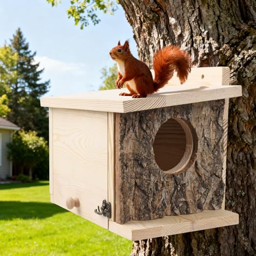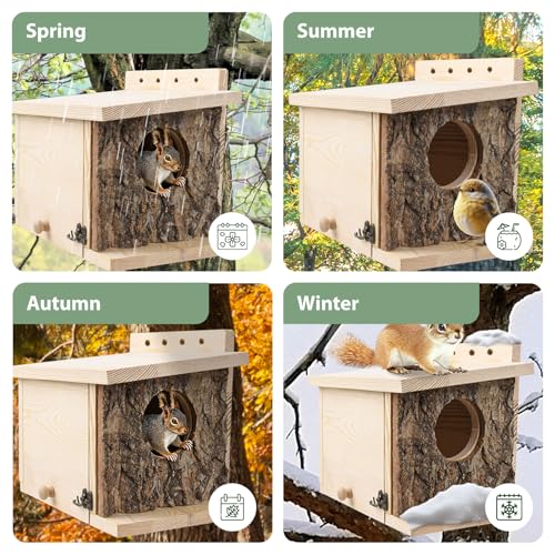 Suitable for Nature/Outdoor Garden: Our squirrel nest for outside is perfect for small wild animals in nature, such as squirrels, chipmunks, bluebirds, tits, etc. this durable wooden squirrel house helps protect squirrels from harsh weather and predators while offering them a natural refuge.