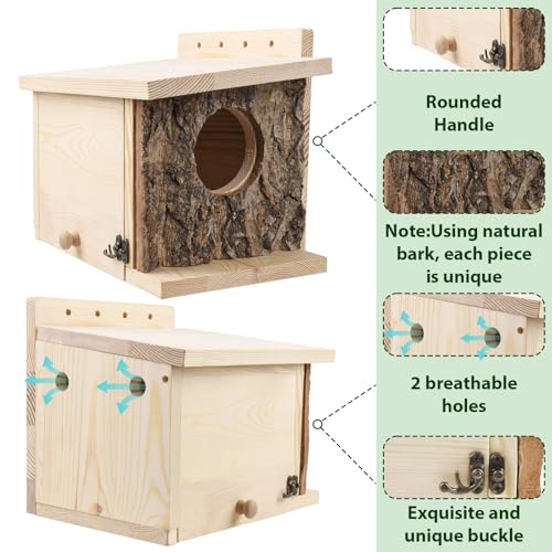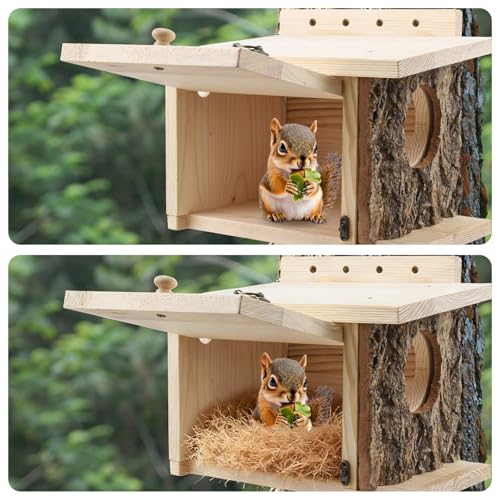 Natural Pine Wood Design:Our squirrel nesting box is made from premium pine wood, the sturdy design, right side the appearance of the poplar bark (Note:Using natural bark, each piece is unique) and the left side is designed with 2 ventilation openings,We also designed support points on the base plate for squirrels to jump in and out.perfect for providing a safe and cozy space for squirrels in your backyard or garden.