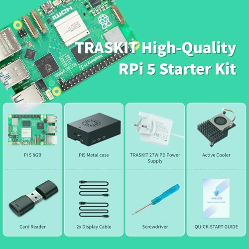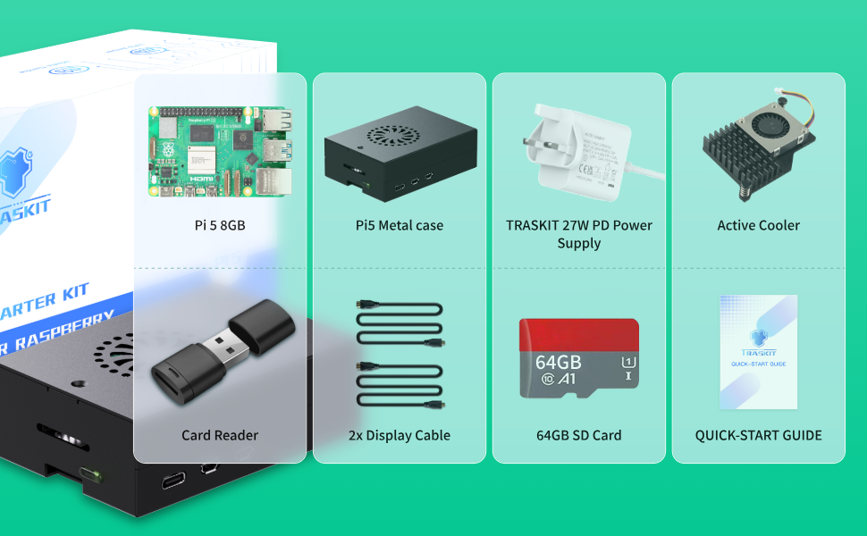 Package Include: 1x Pi 5 8GB Board, 1x 64GB SD Card (The new release OS Bookworm pre-Installed), 1x 27W USB-C PD Power Supply, 1x Pi 5 Metal Case, 1x Active Cooler, 1x Card Reader, 2x Cable, 1x Instruction Manual.
