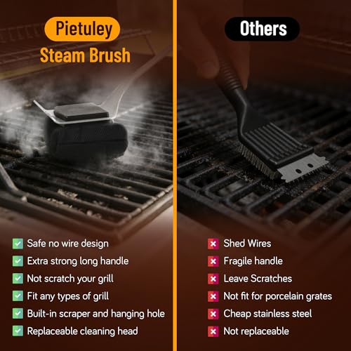 【Safe & Efficient】 Pietuley bristle-free grill brush ensures family safety by eliminating the risk of loose wire bristles in your food. Unlike traditional brushes, no dangerous wires can break off or be accidentally consumed.