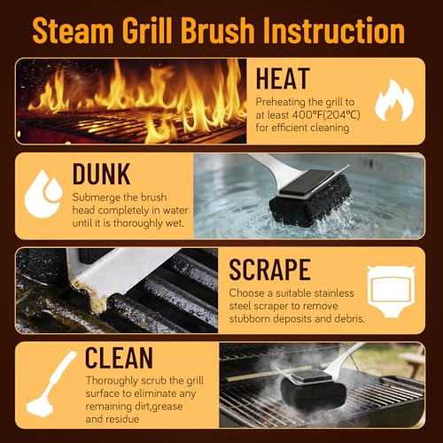 【Easy to Use】 Just heat the grill, dip the brush in water, and let steam-cleaning technology lift away grease effortlessly. For safety, preheat to over 400°F (204°C) and turn off burners before cleaning.