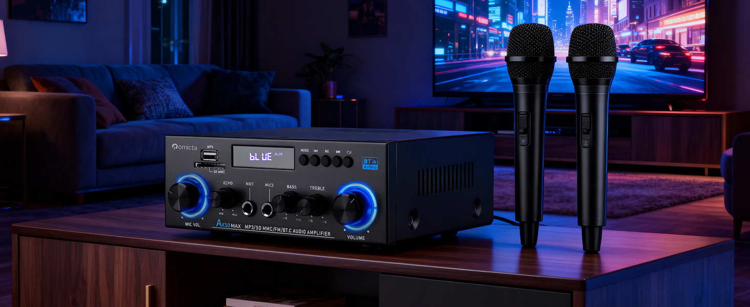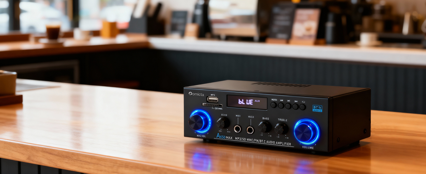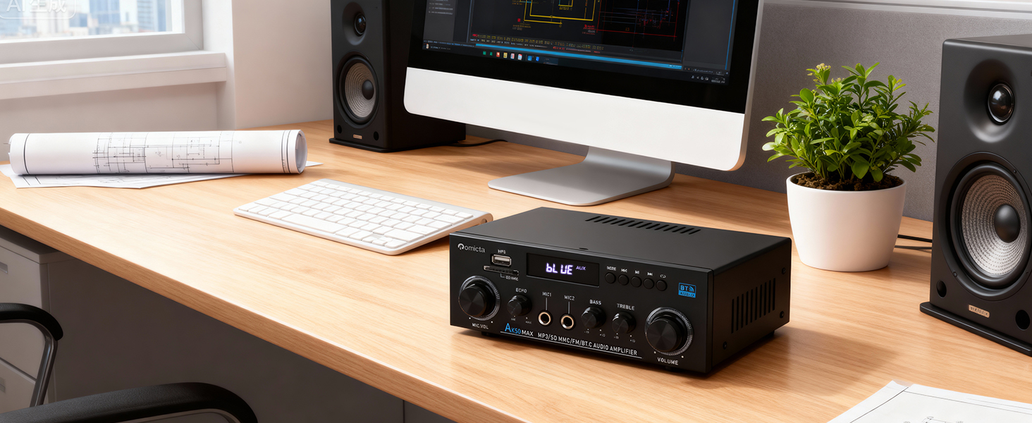 - 400W x 2 Power Output: The Romicta AK50MAX audio amplifier is completely redesigned to deliver a maximum output of 400W per channel (with 50W per channel as continuous power), perfectly suited for driving passive speakers from 4″ to 16″. Its compact build makes it perfect for home cinema, karaoke and multimedia sound systems, fitting seamlessly on any shelf or A/V unit.
