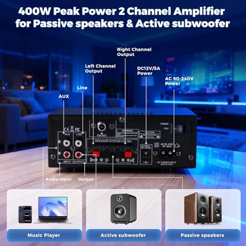 Stereo Audio HiFi Amplifier, 800W Bluetooth Amplifier 5.0, 2 Channels 12V/230V, LCD Display, SD/USB, FM Radio, Compatible with Active subwoofer and passive speakers
