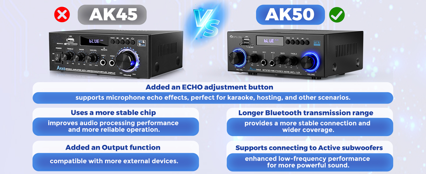 - Precision Bass & Treble Control: Equipped with dedicated volume, treble and bass knobs, the AK45 ensures fine tuning of your audio for an immersive listening experience. A handy remote control is also included for ease of adjustment—just remember to remove the protective plastic sheet from the remote before use.