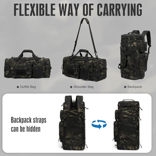 - 【3-in-1 Duffel Bag Backpack】The military duffle bag can be used as a shoulder bag, holdall bag, or backpack. Features removable adjustable shoulder straps for easy single-shoulder carrying. Two shoulder straps are cleverly stowed in a rear zippered compartment, allowing instant conversion to comfortable backpack mode. Constructed from 900D double-layer fabric, it delivers outstanding water resistance, scratch resistance, and tear resistance for durable companionship.