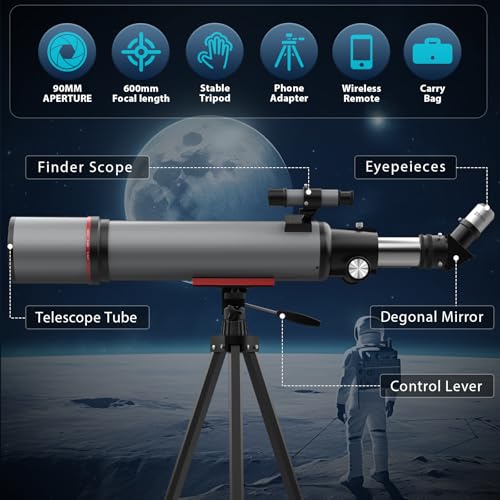 【90mm Large Aperture Refractor】The telescope is designed for astronomy enthusiasts. The fully coated green optics glass lens and 90mm large aperture equipped on the telescope for adults can capture more light, and the 600mm refractive lens can increase the light transmittance and reduce the reflection of light, clearly capturing the details of the moon, stars, jupiter and other planets. Bring an ultimate observation experience and brighter, clearer images.