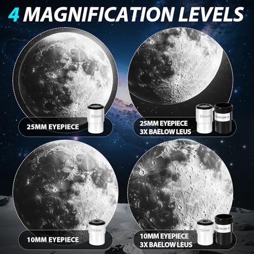 【4 Flexible Magnifications: 30x to 180x】The telescopio profesional includes two excellent-quality 10mm/25mm eyepiece and a 3x Barlow lens, which can be combined to achieve 30x, 60x, 90x, and 180x magnification. Kids 8-12 & beginners can quickly locate and observe the moon at low magnification, while adults can explore the details of the planets at high magnification. Telescopes of different magnifications meet various exploration needs, and the whole family can share the fun of astronomy.