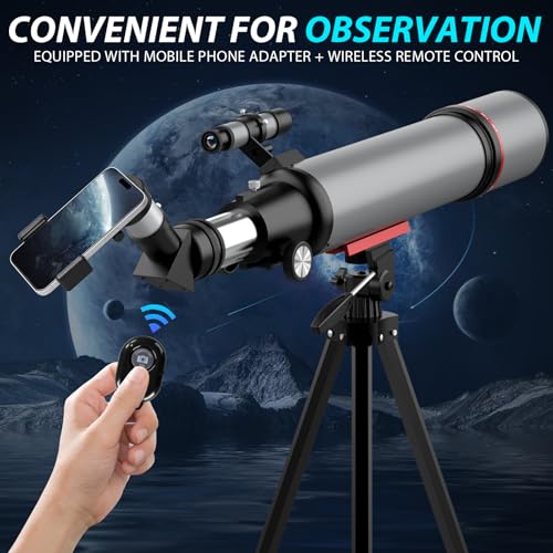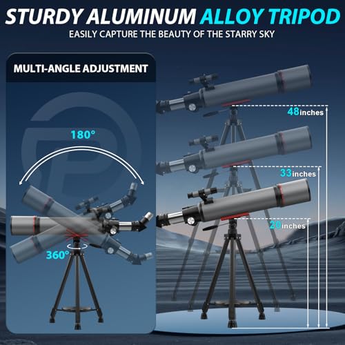 【Sturdy & Adjustable Aluminum Tripod】The sturdy aluminum alloy tripod that pairs with the telescope for adults high powered has features multiple angle adjustments (180° and 360° rotation) and height adjustment from 20 to 48 inches. Which can help you easily adjust the height and orientation, precisely track objects, with the phone adapter and wireless remote, you can take some amazing images. And is an ideal choice for backyard astronomy, camping trips and various outdoor adventures.