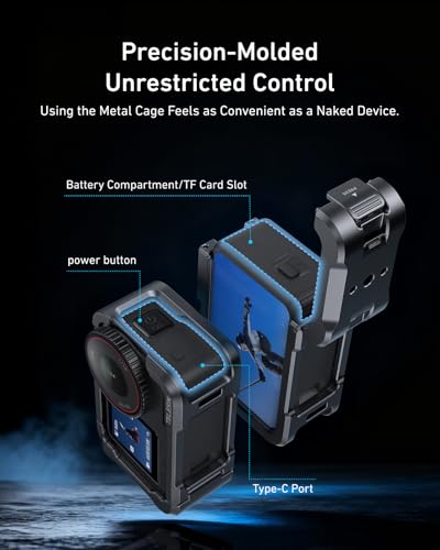 【Quick-Release Battery & Full Access Design】Features a press-to-open quick-release battery door for fast, one-hand operation. Power button, battery compartment, TF card slot, and Type-C port remain fully open and accessible—no need to remove the For DJI Action 6 metal case during use.