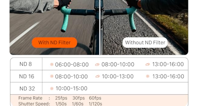 Filter suggestions for different times of day. ND filters reduce sensor exposure and maintain natural motion blur, while ND8/16/32 offer precise, fixed light control for various lighting conditions.