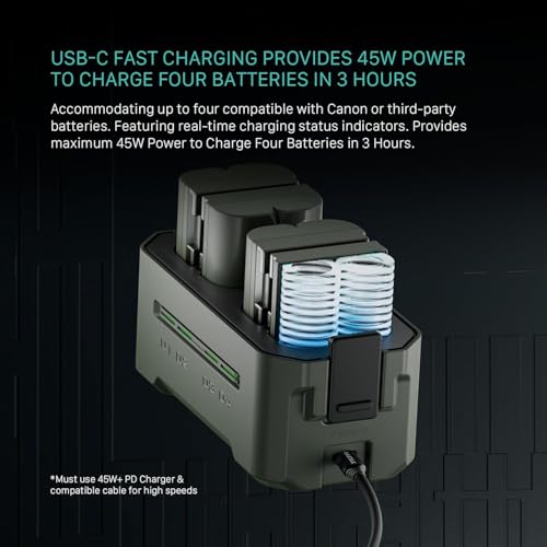 USB-C FAST CHARGING Provides maximum 45W Power to Charge Four Batteries in 3 Hours. (Must use 45W+ PD Charger & compatible cable for high speeds)